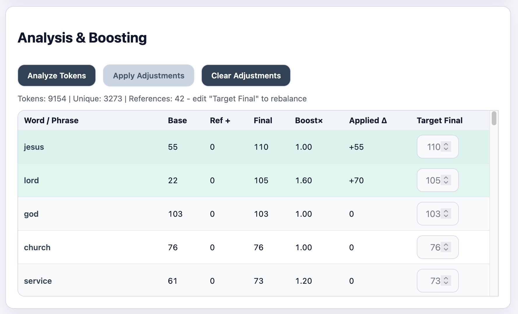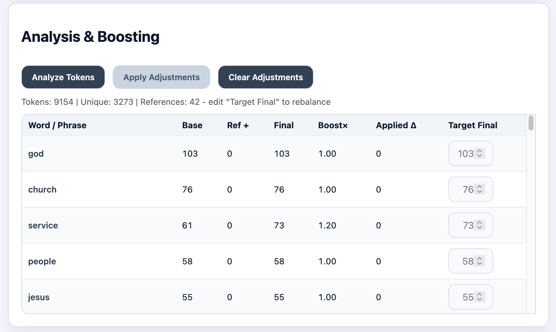 So why not allow my generator to also list the words used, in order, with counts and for adjustments to be made at a granular level? Essentially, some analysis to take place before generating: