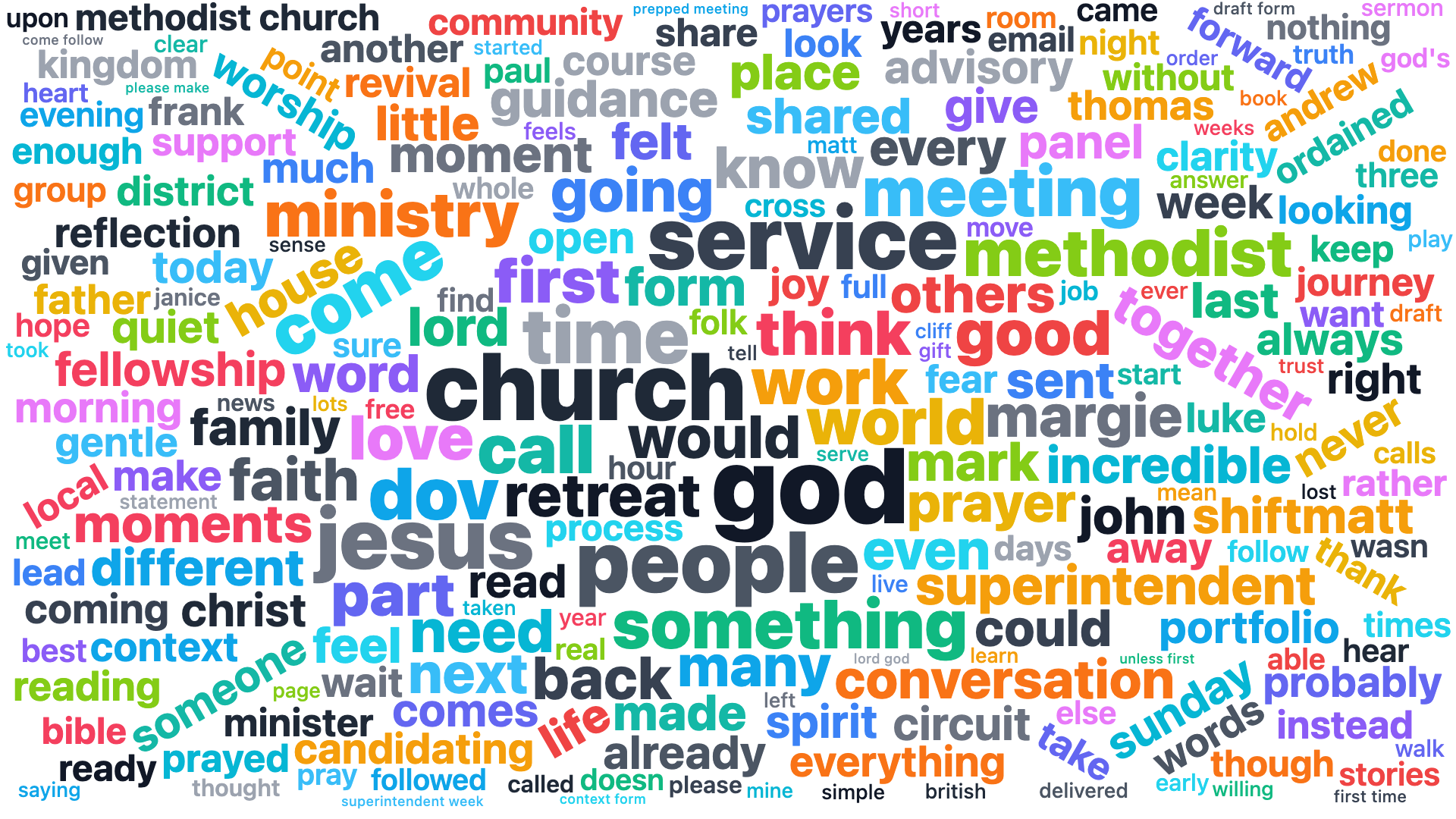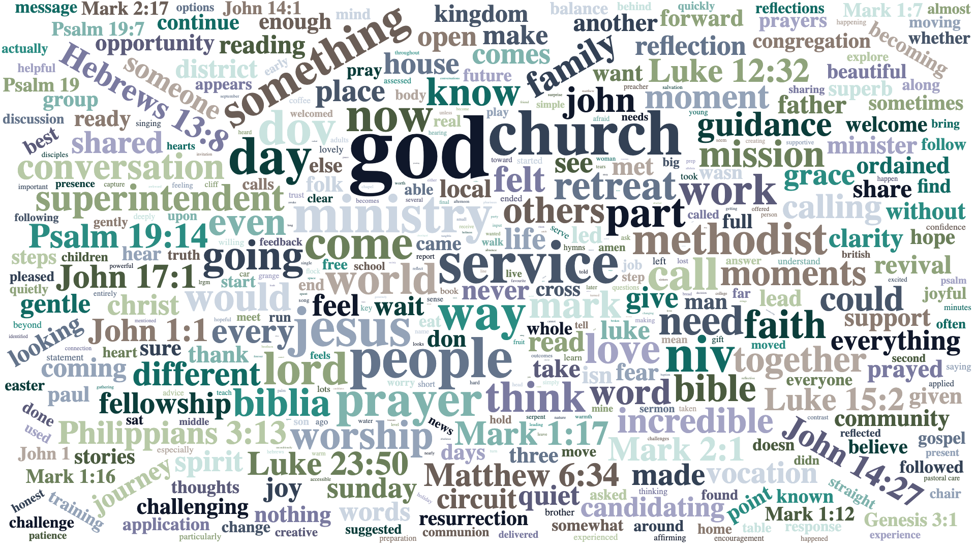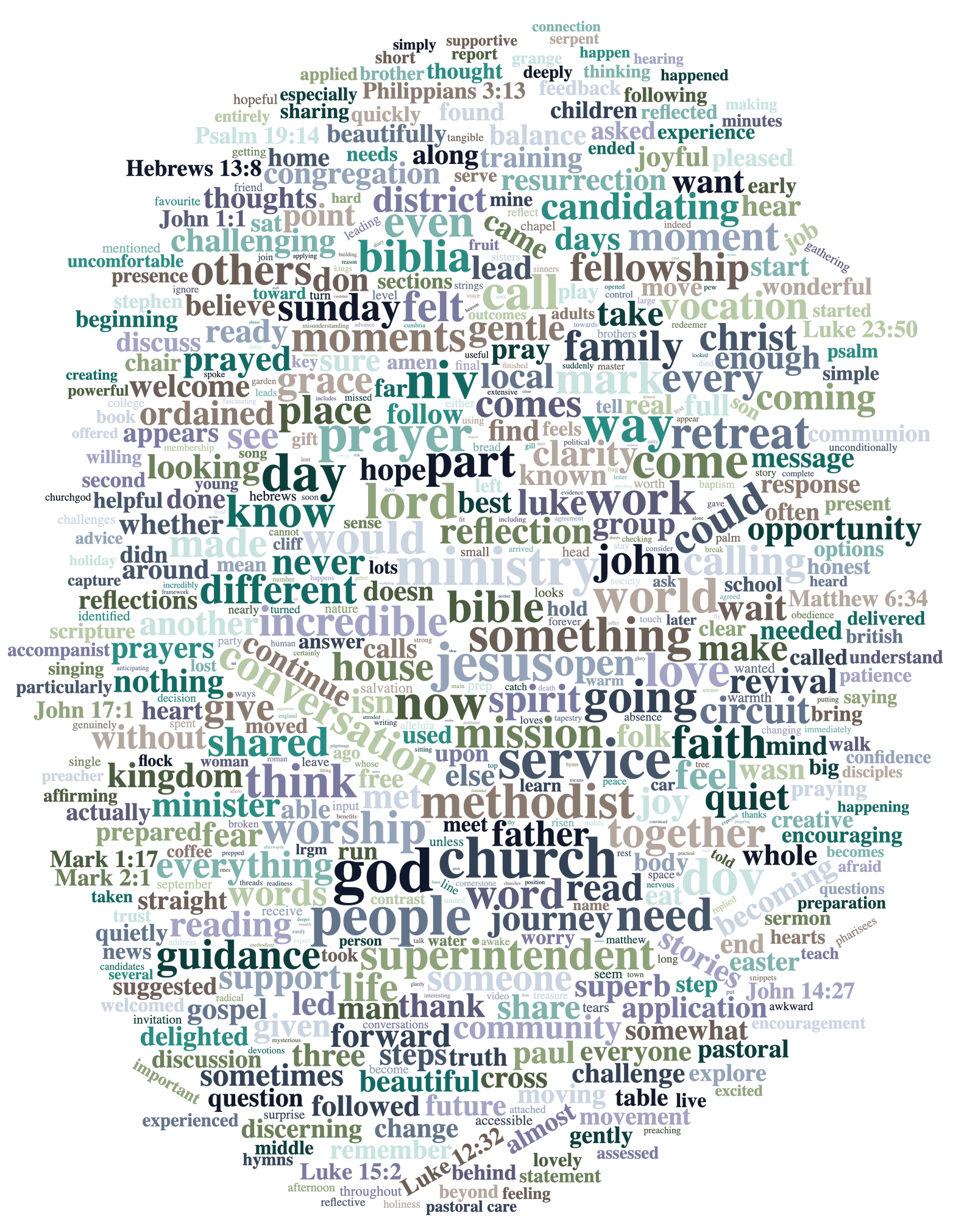 Then I thought, I need it to also detect Bible references, and if I would like those to stand out in the final output, they might need a weighting too. It became quite clear quite quickly that nice looking word clouds that reflect the desired outcome are an art-form that require both mathematics and some creative massaging of data: