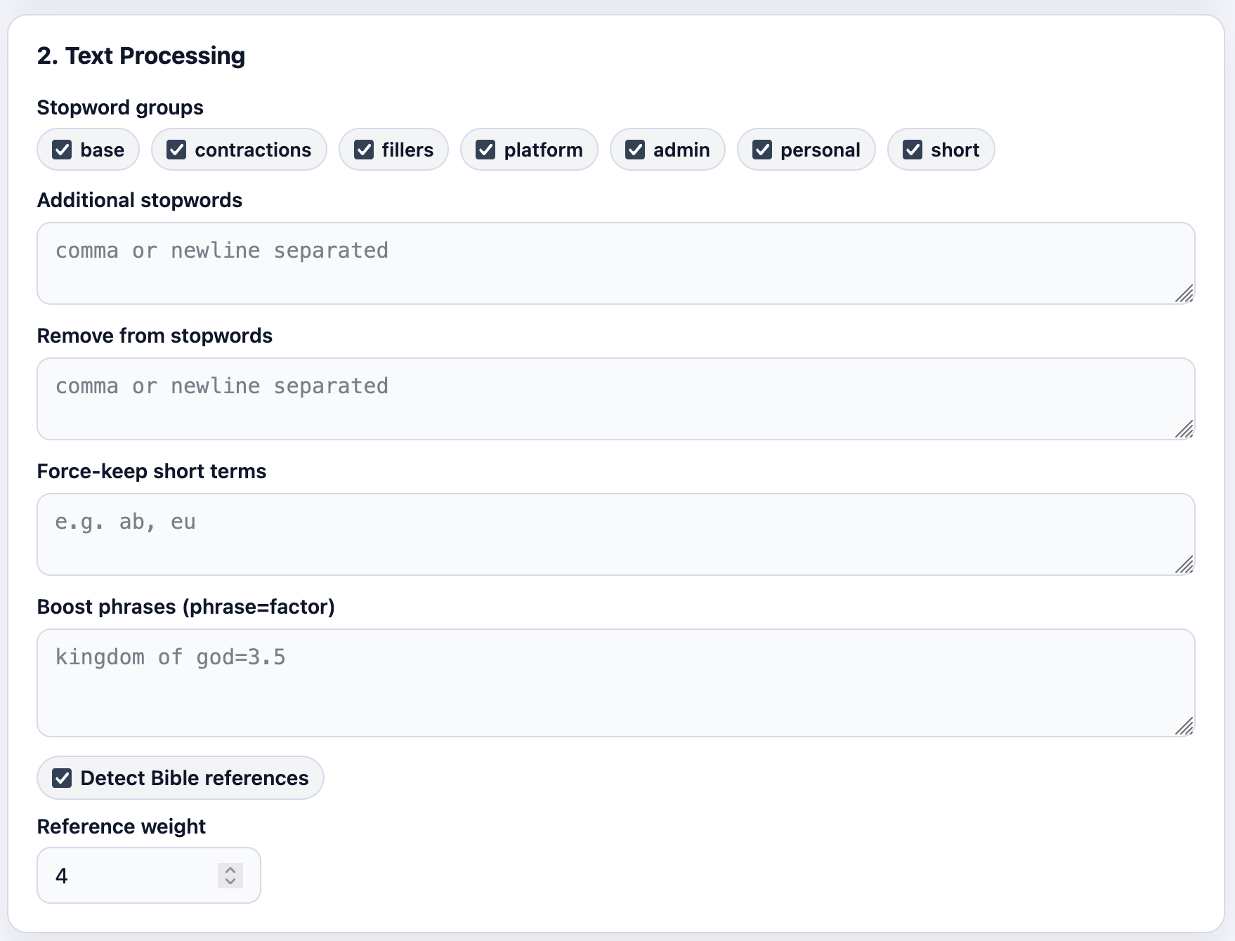 I wanted some customisation for Text Processing: Stopwords (a new phrase for me), which are excluded from the analysis, I needed to exclude words like 'the' and 'and'...etc. I wanted to exclude words from the JSON that are added as part of Ghost's export and other fillers. Whilst also making it flexible enough to customise additional stop words, remove stopwords (thereby including them!) and boost phrases or words by a multiplier. Riiight.