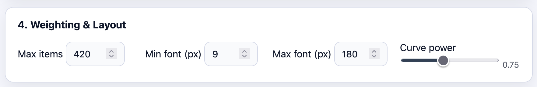 So what about weighting and layout. Well I need to decide on the maximum number of items, the minimum and maximum font and what's called the curve power, essentially how much bigger the most common words appear compared to less common ones. Word clouds are not easy: